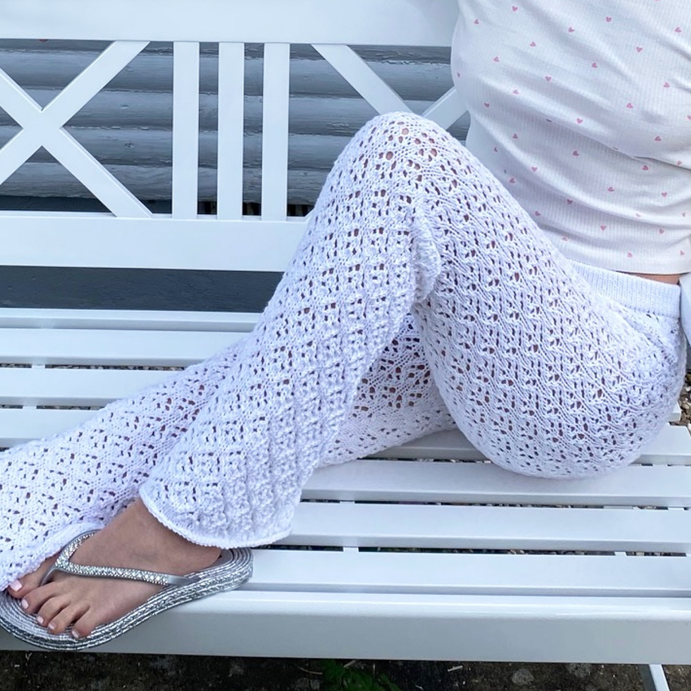Knitted pants with a beautiful lace eyelet pattern. The pants are knitted on circular needle from top to bottom. The elastic band is knitted into the waistband. An elevation i knitted mid back.There is no seaming, except that ends must be sewn in.